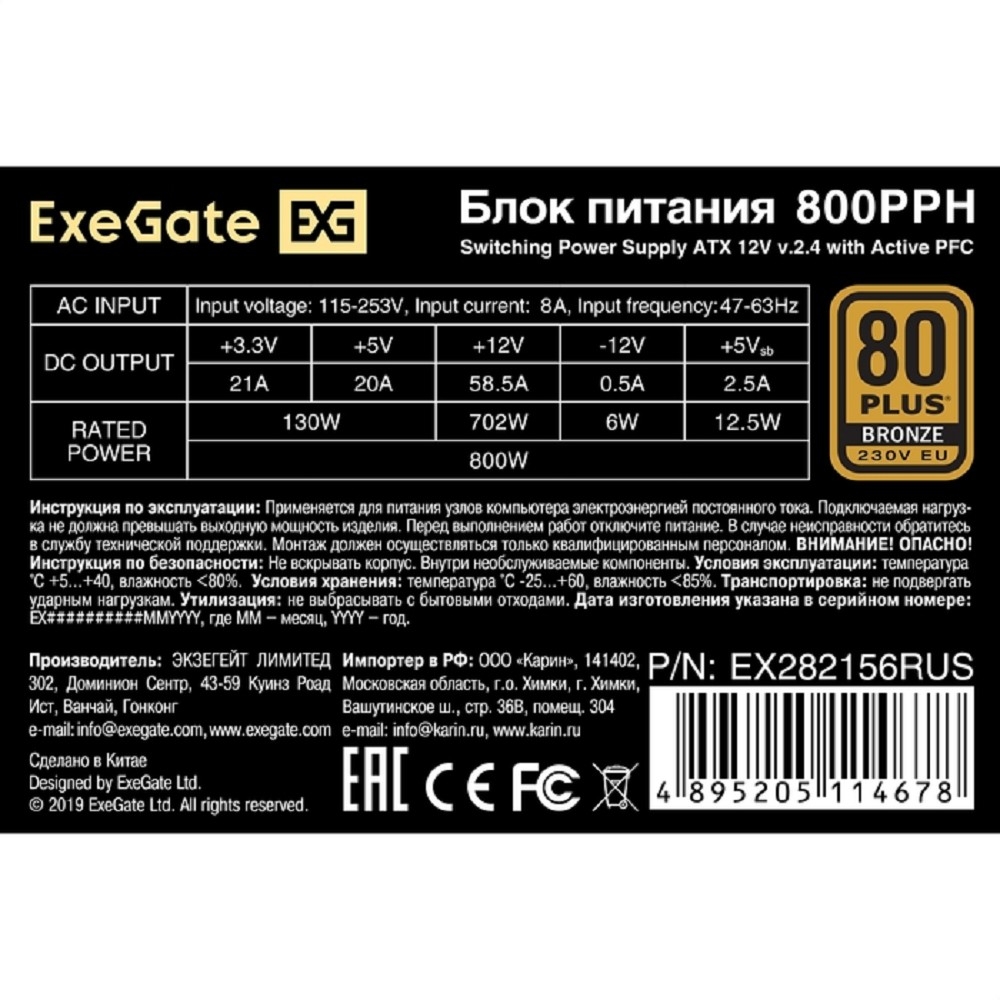 | Описание | Блок питания 800W ExeGate 80 PLUS® Bronze 800PPH |