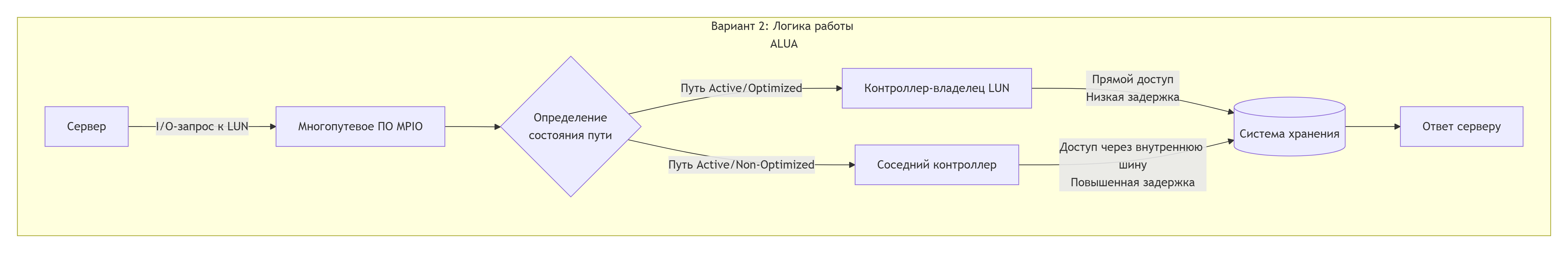 ALUA — это не отдельная архитектура, а стандарт протокола SCSI (SAM-5), который реализуется в рамках асимметричной активной-активной (AAA) архитектуры. Она сочетает в себе идеи Active/Active и Active-Passive. Оба контроллера активны и могут обрабатывать I/O-запросы, но для каждого конкретного тома (LUN) один из контроллеров является предпочтительным (оптимальным). Запросы, пришедшие через «свой» контроллер, обрабатываются напрямую и максимально быстро. Если запрос пришел через соседний контроллер (по неоптимальному пути), он будет обработан, но с чуть большей задержкой, так как потребуется внутренняя коммуникация между контроллерами. Многопутевое программное обеспечение (multipath I/O) использует метки ALUA, чтобы всегда направлять трафик по оптимальным путям, автоматически перераспределяя его при сбоях.