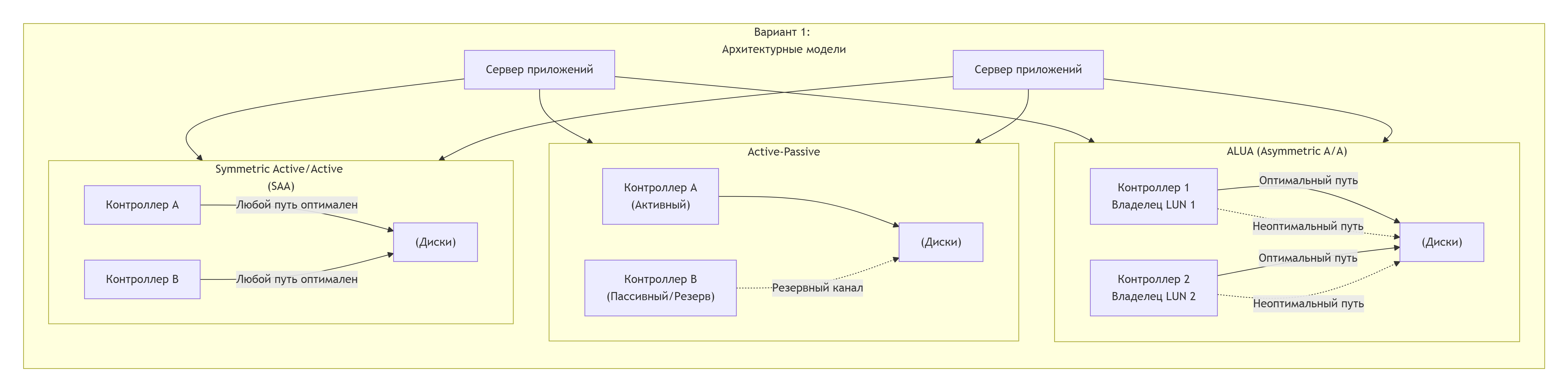 | Критерий | Active-Passive | ALUA (Asymmetric A/A) | SAA (Symmetric A/A) |